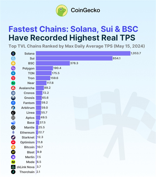 值得一提的是,在今年4月6日,面对memecoin的狂潮,Solana的实际日平均每秒交易量(TPS)达到了创纪录的1,504笔,这足以证明它是目前速度最快的大型区块链。这意味着,Solana的速度是以太坊的46倍,是以太坊最大的TPS扩展解决方案Polygon的5倍以上。