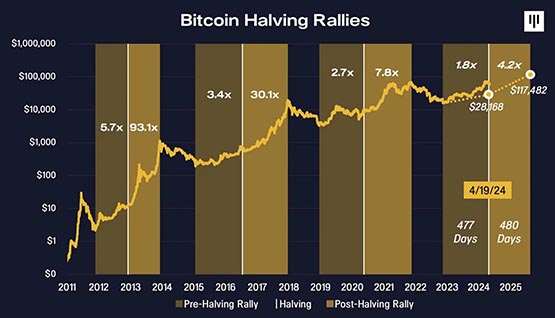 根据该模型,Pantera 在 2022 年 11 月时预测比特币将在 17000 美元触底(而几周后,比特币在 16000 美元左右触底),并在第四次减半前就开始反弹,减半当时的价格为 28,169 美元,并在减半后于 2025 年 8 月达到 117,000 美元的峰值(基于前几次减半反弹周期的平均持续时间估算)。Pantera 表示:十一年来,Pantera 比特币基金平均几乎翻了一倍,很容易想像 2025 年比特币的价格将达到 117,000 美元。