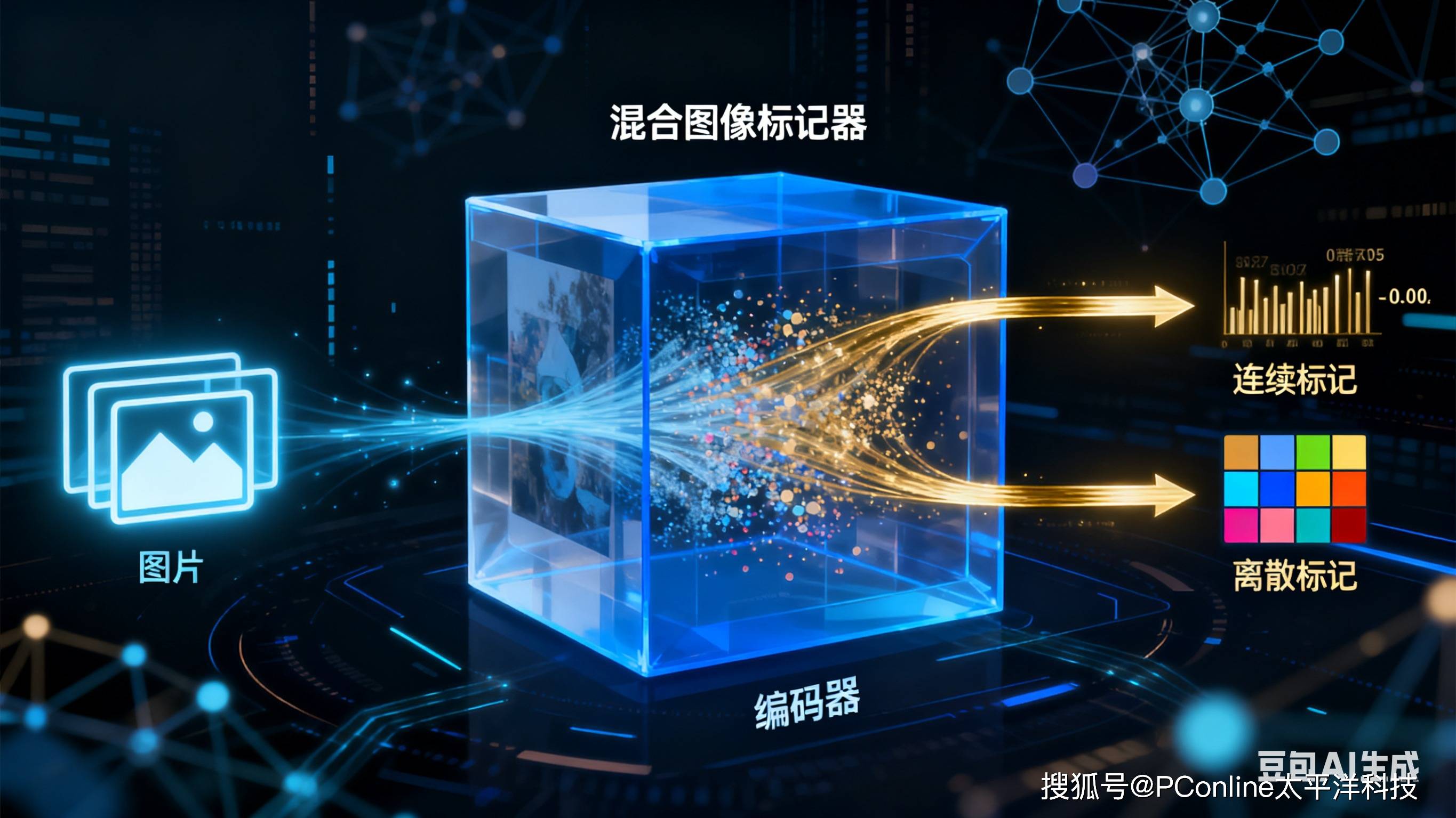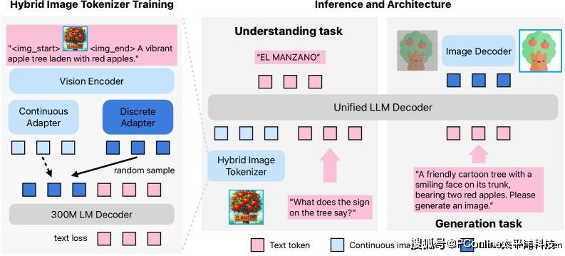 Manzano之所以能实现这一技术飞跃,其关键在于采用了一种创新的混合图像标记器。这一设计理念让模型能够同时输出两种不同类型的标记:用于图像理解的连续标记,它以浮点数形式精确表征图像内容;用于图像生成的离散标记,它将图像内容归纳为固定的类别。由于这两种标记源自同一个编码器,从而有效避免了传统模型中因架构分离而可能产生的内在冲突和信息损失。