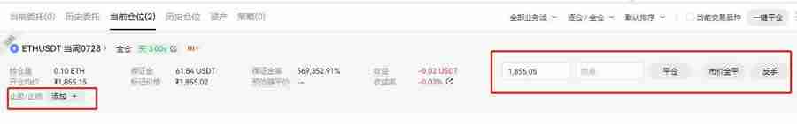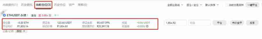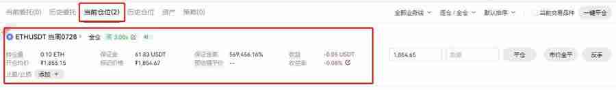 9、挂单成交后,在持仓界面查看订单数据,例如保证金、收益、收益率、预估强平价等。