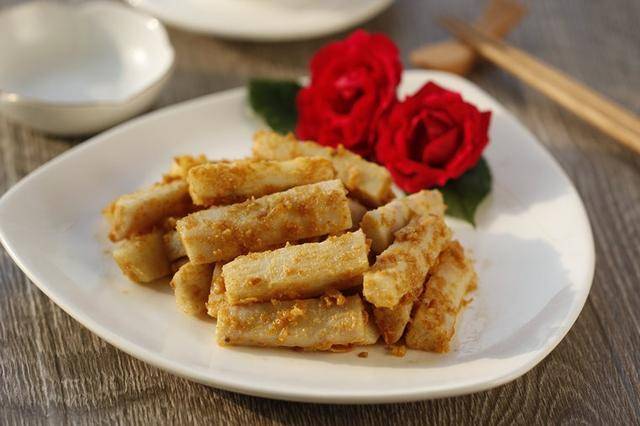 推荐菜谱【金沙山药】 原料: 铁棍山药 咸蛋黄 葱花 油盐