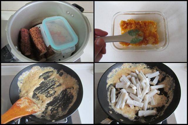 制作过程: 将铁棍山药段和咸蛋黄一起放入蒸锅中大火蒸上十分钟将其蒸熟; 蒸熟后的铁棍山药拿出来去皮后切成条备用; 咸蛋黄趁热用勺碾压成泥; 烧热锅放入少许油,倒入咸蛋黄泥进锅翻炒,炒至出金沙,将准备好的铁棍山药放进锅中翻炒,让山药条表面均匀地裹上咸蛋黄泥即可。