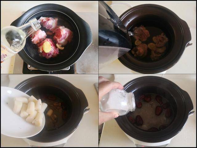 制作过程: 将棒骨块冷水下锅焯猪肚,加入少许姜片和高度白酒去腥,焯出浮沫后捞出放入电炖锅中,加入少许姜片和适量的水(注意煲汤时水要加足,不用中途加水) ,加盖后按下电炖锅上炖煮骨汤的功能键, 待到还剩下半小时的时候加入准备好的山药段和洗净的红枣继续炖煮, 炖煮好后加入少许盐和胡椒粉调味即可。