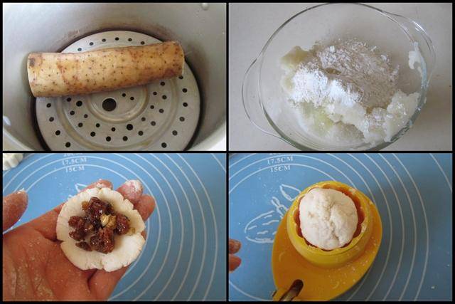 制作过程:选用铁棍山药,吃起来更香糯粉面, 将其洗净后放入蒸锅中将其蒸熟; 蒸熟的铁棍山药去皮后趁热将其用刀背碾压成泥, 再加入适量的熟糯米粉(糯米粉提前蒸熟或者用微波炉打熟) ,将它和成光滑的山药糯米面团。 将适量的山药面团按压成饼,中间包入少许葡萄干,搓成球后将其放入模具中,按压成饼定型后即可。