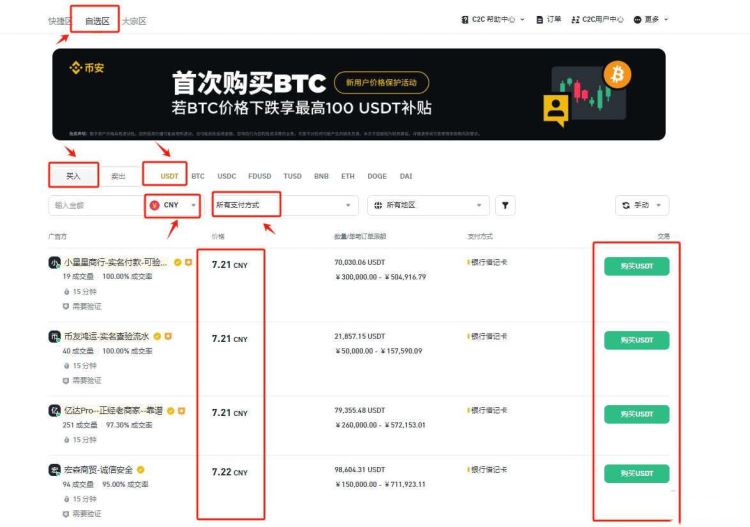 6、Before engaging in spot trading, you need to acquire USDT. You can do this through "One-Click Buy" — "Select" — "Buy." Make sure to choose CNY as your fiat currency, and select the merchant based on your needs.