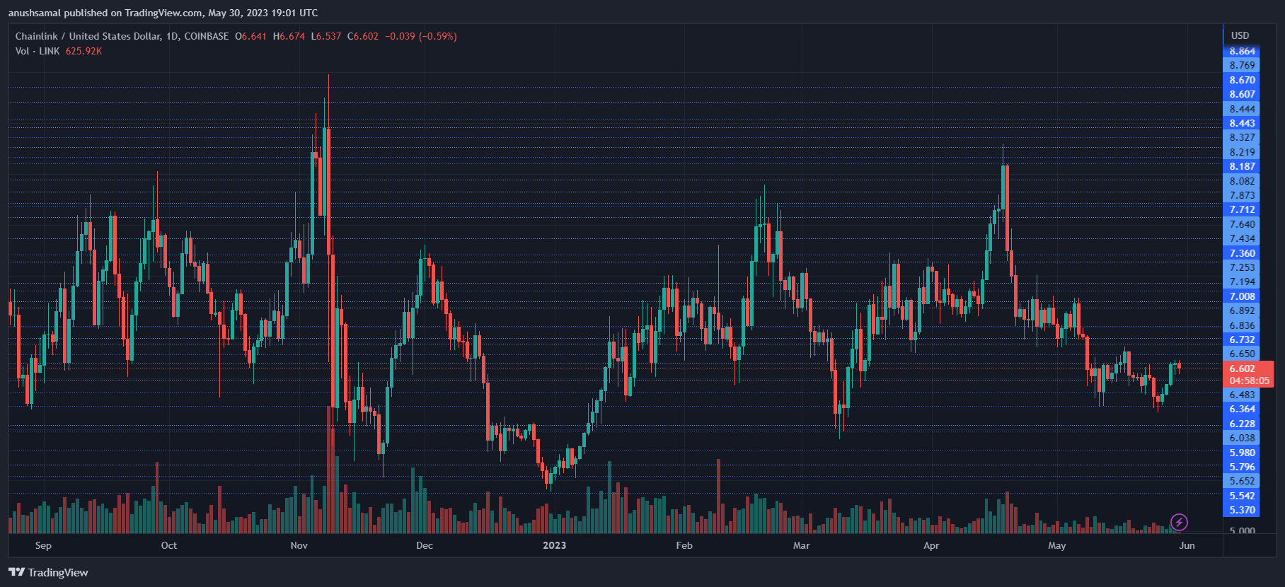 目前,Chainlink (LINK) 的交易价格约为 6.60 美元。然而,这个价位一直是一个强劲的阻力位。尽管如此,多头仍在努力阻止价格进一步下跌。LINK 的上方阻力位在 6.80 美元附近。