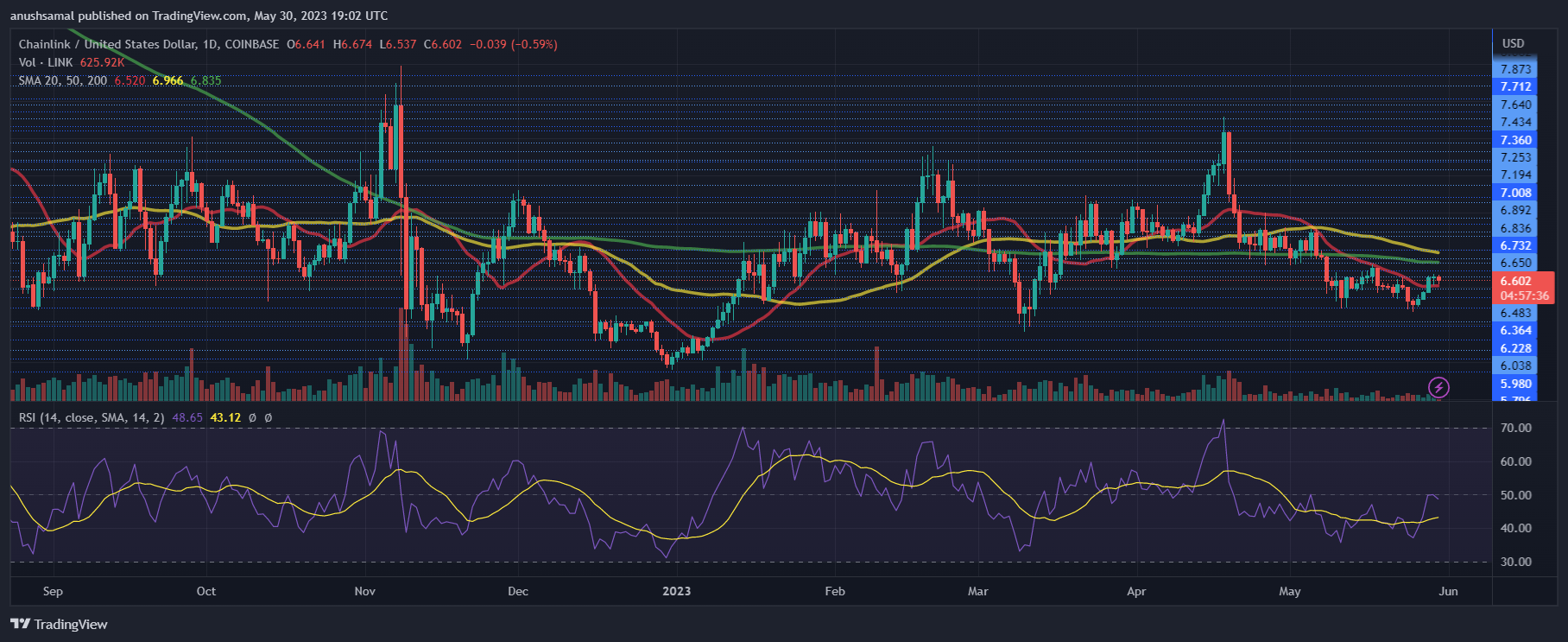 为了重新获得上涨势头,LINK 必须突破 6.60 美元的水平,这将使山寨币能够在 20 日 SMA 上方交易。