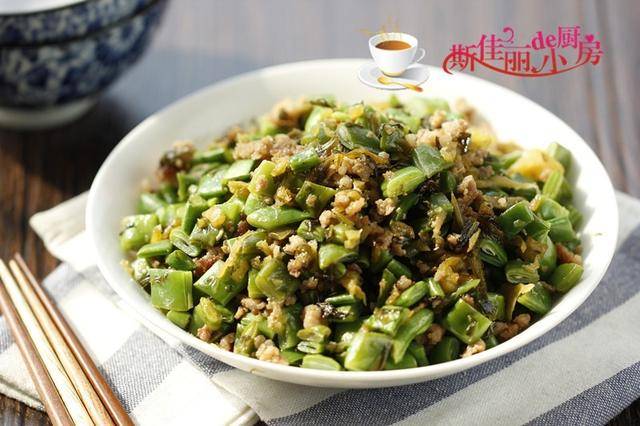 原料: 肉末 雪菜 四季豆 生抽 料酒 油盐
