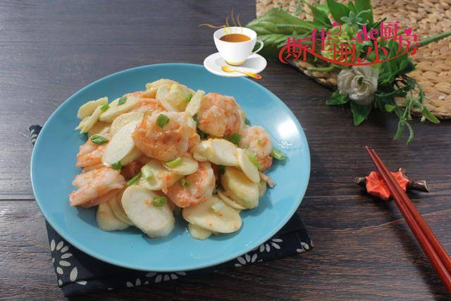 原料:鲜虾茭白料酒 淀粉 葱花 姜末 油盐