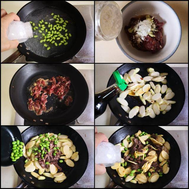 制作过程: 将茭白去除外皮后露出白色的肉,清洗干净后切成片备用;烧锅水加入1小勺盐,将毛豆米放进锅中焯煮2、3分钟后捞出备用; 牛肉切成片加入少许盐、淀粉、料酒、生抽和姜末等调味料拌均匀腌制3分钟备用; 烧热锅放入适量的油, 将腌制好的牛肉片放进锅中翻炒至变色后捞出备用;锅中留少许油,加入茭白片放进锅中翻炒几下,加入1勺生抽翻炒上色,加入准备好的牛肉和毛豆米放进锅中翻炒几下,加入少许盐调味,翻炒均匀即可。