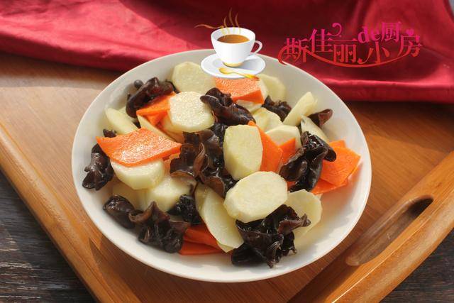 推荐菜谱【木耳胡萝卜炒山药片】 原料:黑木耳 铁棍山药胡萝卜 油 盐