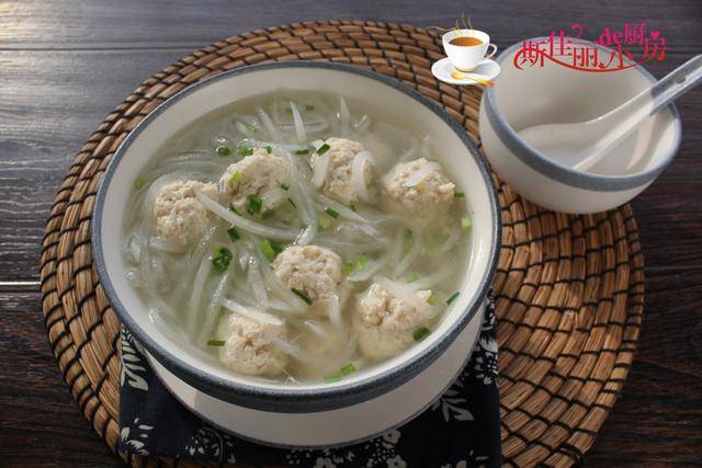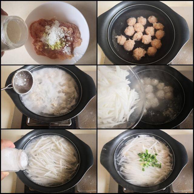 制作过程: 将白萝卜去皮后切成细丝备用; 鸡脯肉剁成肉泥后加入少许盐、淀粉、料酒和姜末等调味料顺着一个方向搅拌上劲腌制3分钟备用。 烧锅水,将鸡肉泥挤出肉丸后冷水下锅去煮,冷水下锅去煮更利于肉丸定型,待到煮开后撇去浮沫, 再加入准备好的萝卜丝放进锅中去煮, 煮至白萝卜丝微微透明后加入少许盐和胡椒粉调味, 最后放入少许葱花即可。