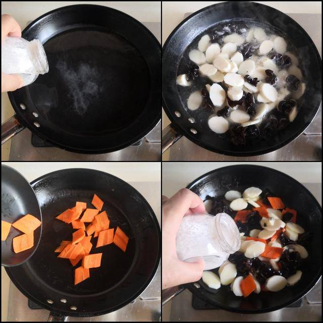 制作: 将黑木耳用冷水泡软,铁棍山药和胡萝卜去皮后切成片备用。 烧锅水加入1小勺盐,将黑木耳和山药片放进锅中焯上一、两分钟后捞出备用; 烧热锅放入适量的油,先加入胡萝卜片进锅翻炒几下,用油煸炒胡萝卜更利于胡萝卜的吸收,再将焯好的木耳和山药放进锅中继续翻炒两下,最后加入少许盐调味翻炒均匀即可。