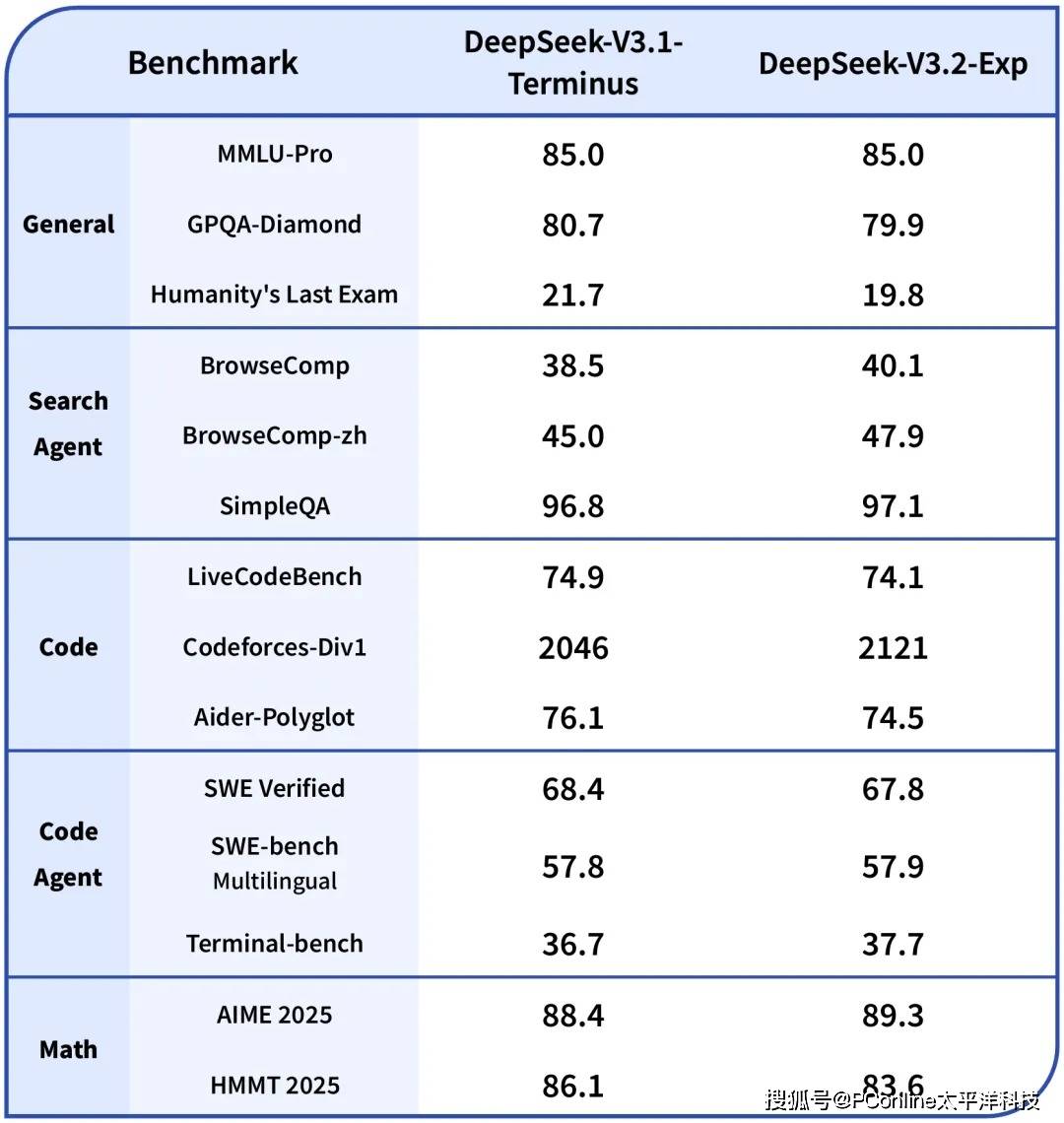 为确保评估的严谨性,DeepSeek-V3.2-Exp 的训练配置与 V3.1-Terminus 严格对齐。根据 DeepSeek 提供的公开评测集数据,V3.2-Exp 的综合性能表现与前代 V3.1-Terminus 基本持平,验证了新机制在维持模型效果方面的有效性。
