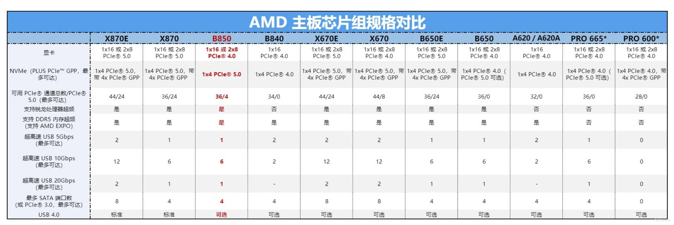 测试之前,我们先来看看新的B850主板芯片组详细规格。作为一款主流级别的芯片组,AMD B850的规格无疑能够充分满足大多数用户的需求:1.它支持处理器与内存的超频;2.PCIe插槽与M.2插槽均支持最新的PCIe 5.0规范;3.原生提供USB 3.2 Gen2 x2 20Gbps接口;4.芯片组内置8条PCIe 4.0通道与4条PCIe 3.0通道。配合其合理的价格,主板制造商能够打造出性价比高、扩展性能出色的千元级别主板。