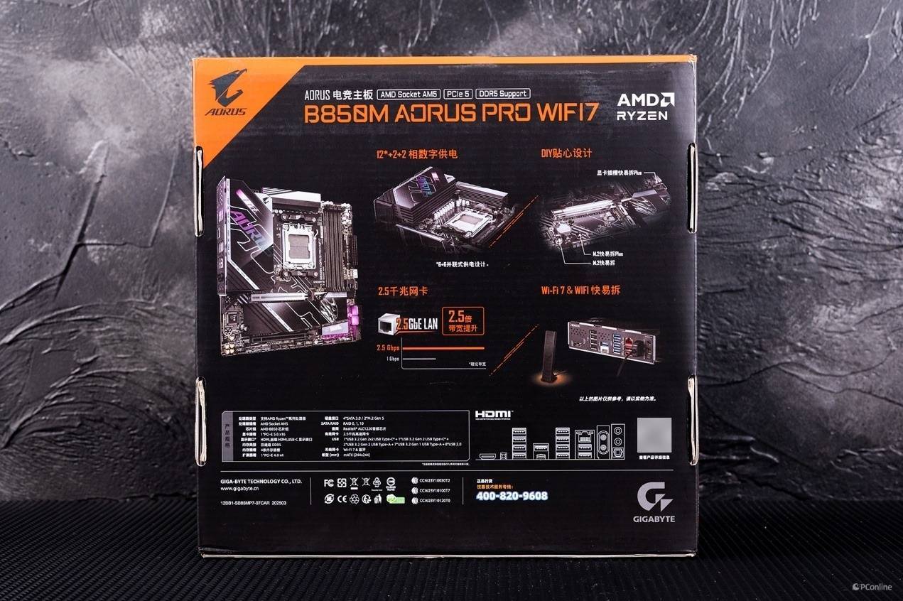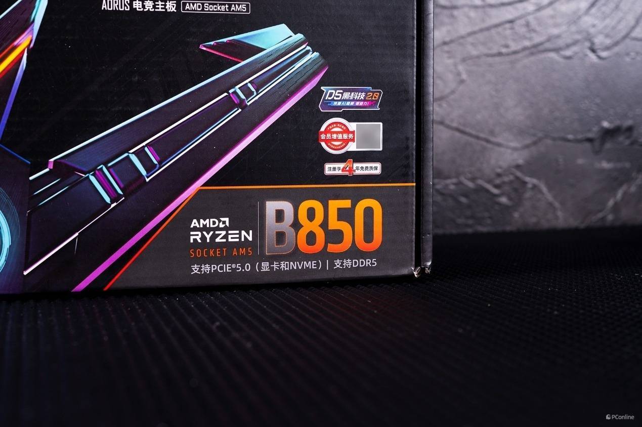 右下角则是AMD B850芯片组的标识,并且下方还写上了PCIE 5.0 Ready,这也表面这款主板支持最新的PCIe 5.0接口。
