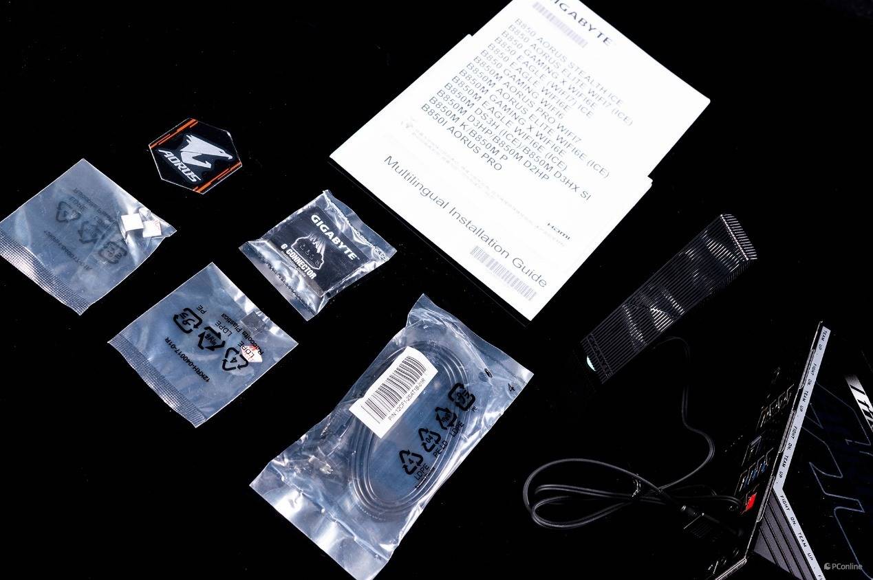 包装内部除了主板本体以外,还有丰富的配件,包括2根SATA硬盘数据线、2套泡棉垫片、1个机箱开机插针集线器、1个黑色磁吸式鲨鱼鳍WIFI天线、1个印有技嘉AORUS浮雕LOGO的金属装饰片以及使用说明书等。