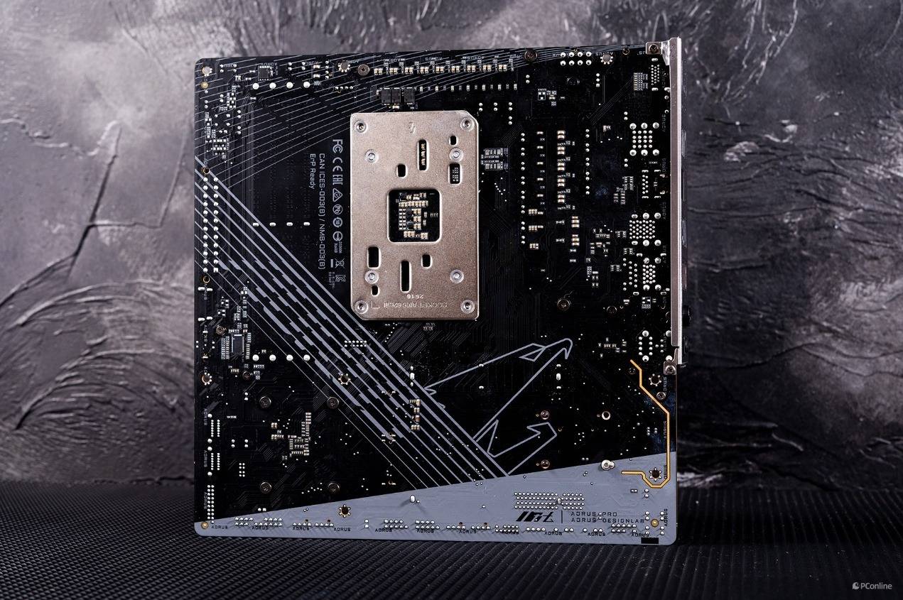 主板背面同样是黑色与灰色相间的设计,并且技嘉还在上面加入了标志性的雕头LOGO以及斜切纹理,让整块主板更显硬核霸气。8层低损耗PCB的应用也让这款主板有了更好的电气性能。