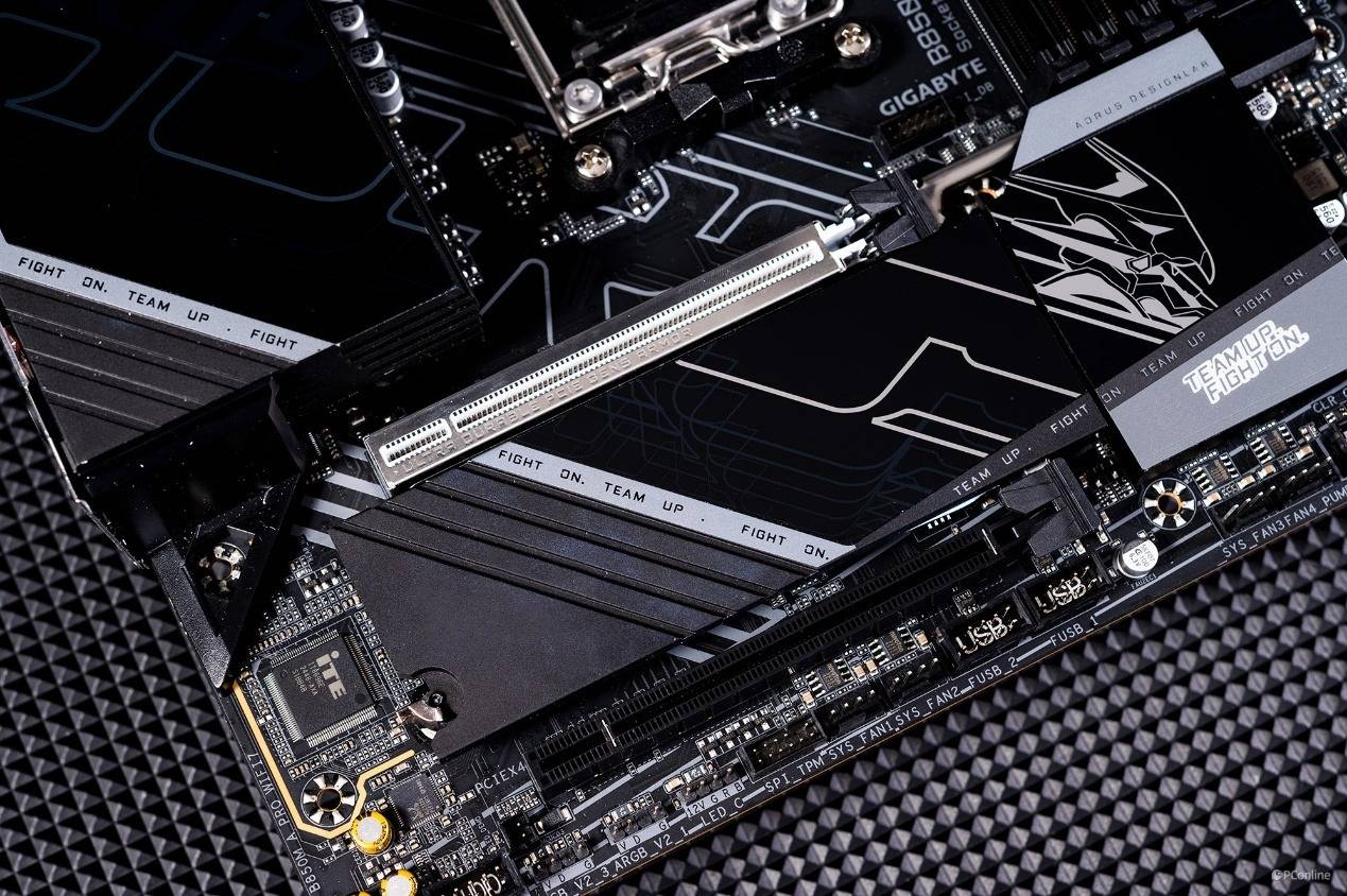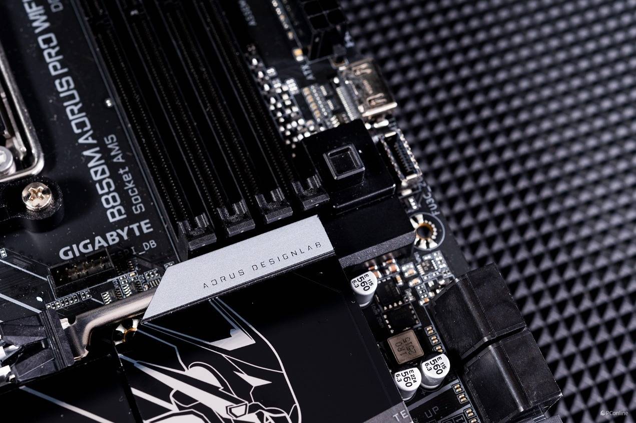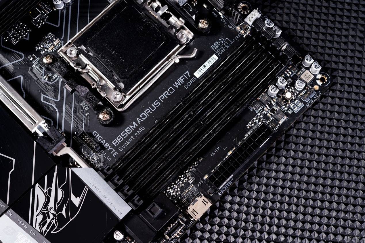 主板共提供了两条全长的PCIe插槽,其中CPU插槽下方的第一条支持PCIe 5.0×16,并且技嘉还为其进行了铝合金强化,应付 80、90 后缀的重量级也非常从容。另一条PCIe插槽则是由B850芯片组提供PCIe 4.0×4带宽。