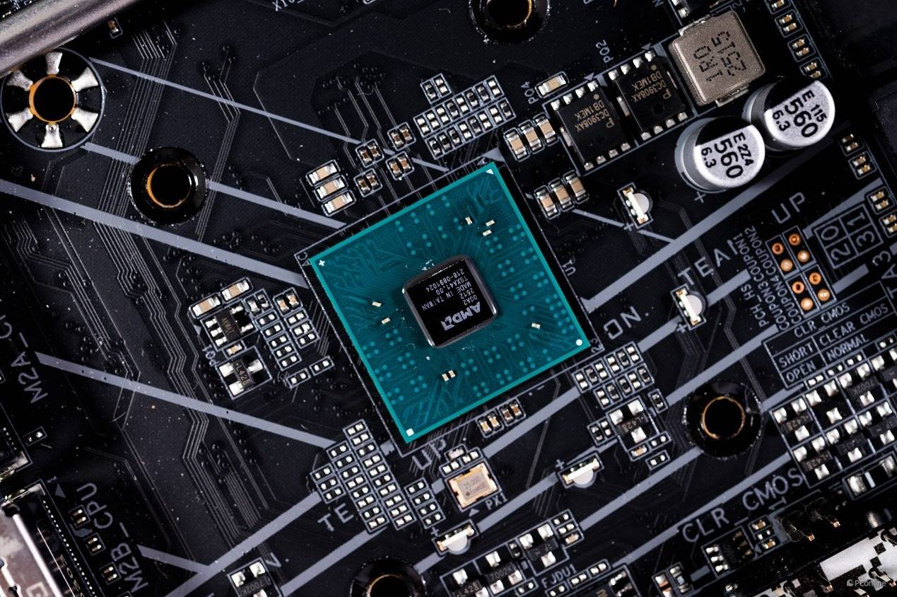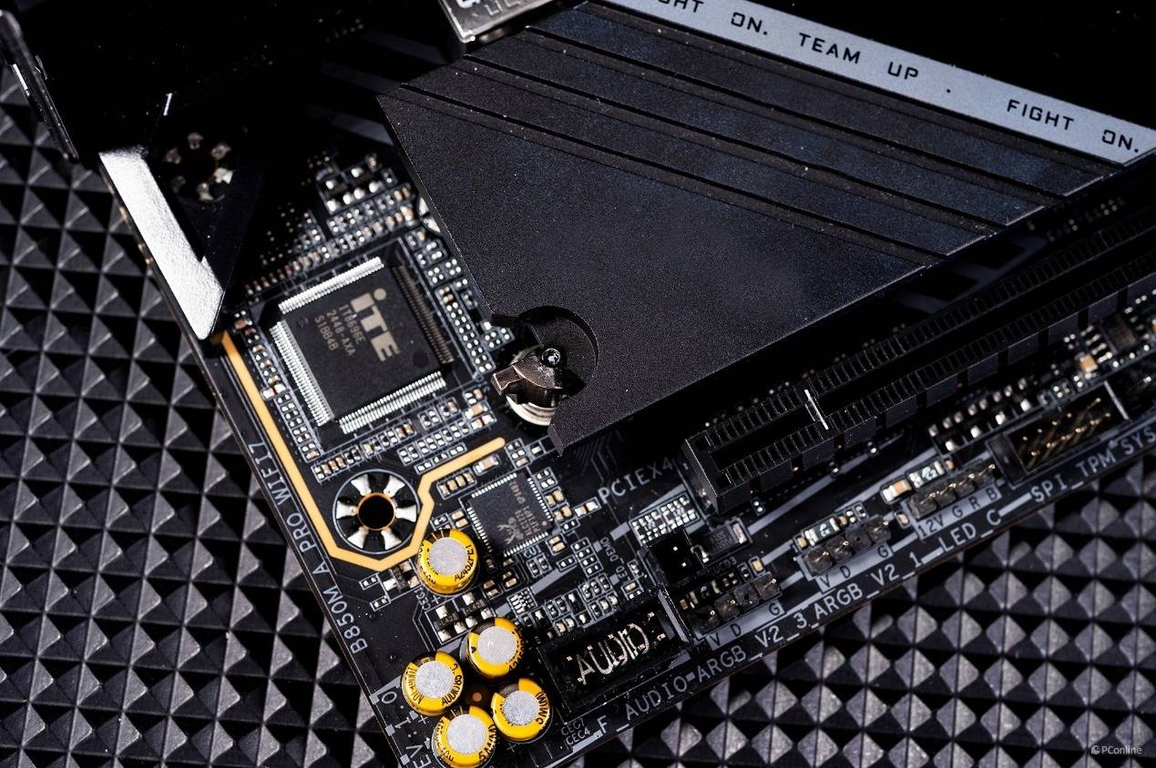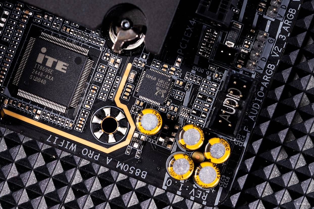 卸下以后就能看到B850芯片。其主要负责I/O接口等一些外设接口的控制及提供部分PCIe通道。