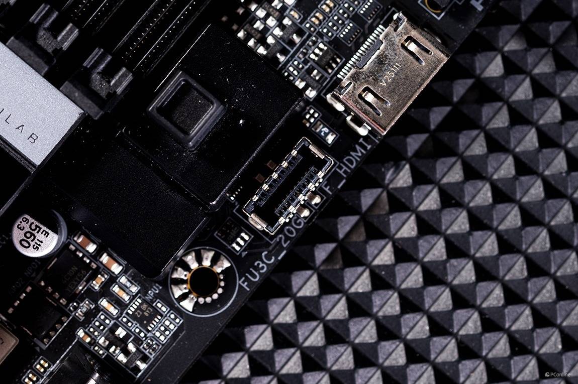 视线往上走,还可以看到主板右侧中部有一个USB-C的前置扩展接针,可以扩展1个前置USB 3.2 Gen 2×2 20Gbps (Type-C)接口。