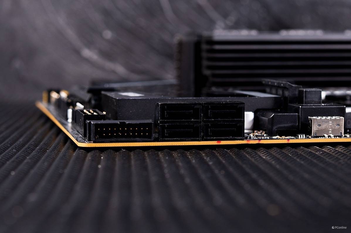 4个SATA硬盘接口则位于主板右下角处,均支持SATA 3.0传输协议,最高支持6Gbps/s的传输速率。90度转置的设计,让玩家在后期加装硬盘时可以更方便的接线。