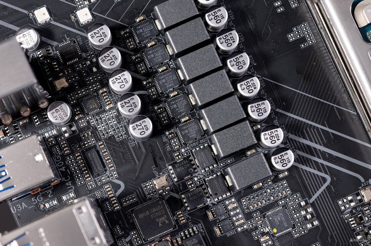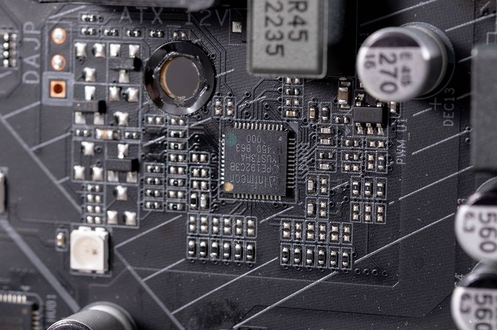 而CPU供电与核显供电的PWM主控芯片则是英飞凌的XDPE192C3B,这是一颗双通道12相的PWM控制器。