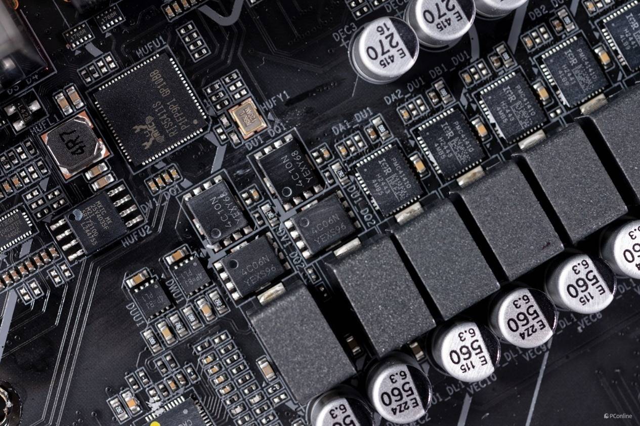 拉进镜头可以看到主板上侧的9相以及左侧的5相供电均采用英飞凌出品的PMC41410 DrMos,最大稳定输出电流为80A。其中负责核显供电的为上侧9相的右侧2颗,其余均为CPU供电。