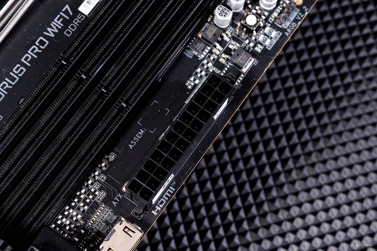 在插槽的右侧则是这款主板的内存插槽,一共配备了4槽DDR5内存插槽,最高支持256GB容量扩展,内存频率最高可支持到8600MHz,为超频玩家预留了足够的超频空间。