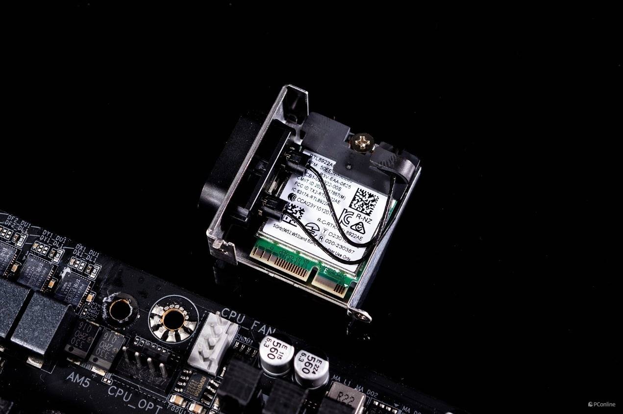另外,拆解主板后还能进一步看到这款主板的音频与网络芯片配置,其中无线网络方面则是Realtek瑞昱的RTL8922AE无线组网方案支持 Wi-Fi 7 与蓝牙 5.4 通信协议,可实现最高1948Mbps的传输速率,速率相较于2x2规格的Wi-Fi 6技术提升两倍。并且RTL8922AE模块还可以同时利用5GHz和6GHz频段带宽时最高可实现2880Mbps的速率,进一步提升整体的数据传输效率。