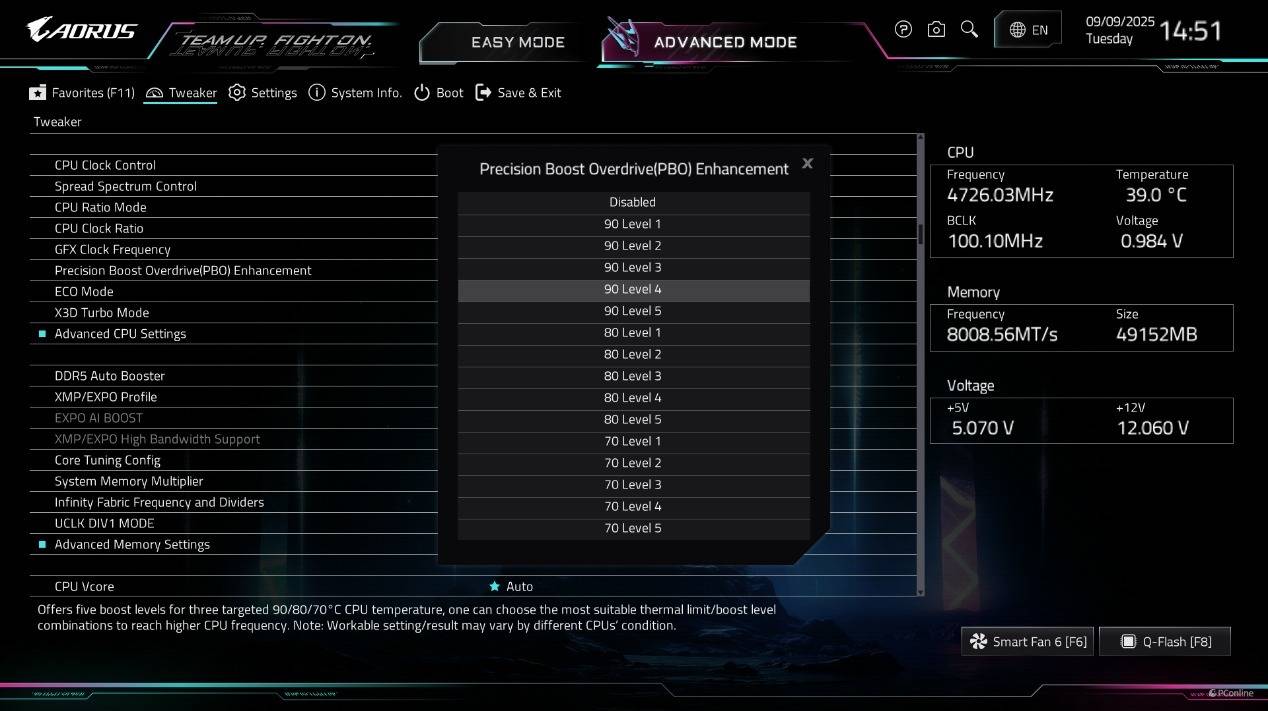 紧接着我们又开启了BIOS内的PBO Enhancement功能,并且将档位调整至PBO Enhancement 90度Level 4。