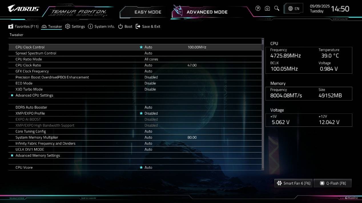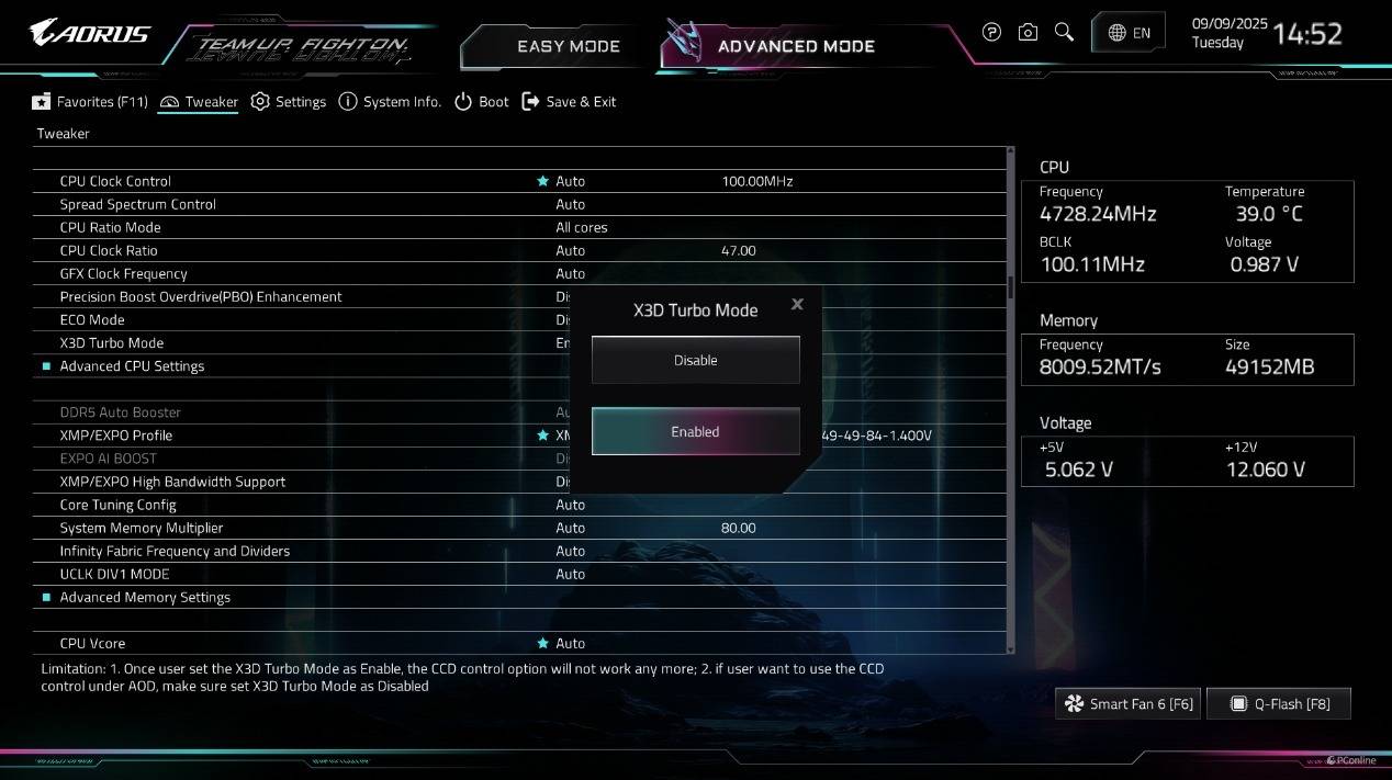 首先在频率/电压控制页面,技嘉提供了一系列参数可供玩家调节,涵盖了CPU以及内存,可玩性非常高。并且如果你跟我们用的一样,是X3D系列的处理器,BIOS中还会有X3D游戏模式的选项,开启后能够在部分游戏中获得更优的性能释放。