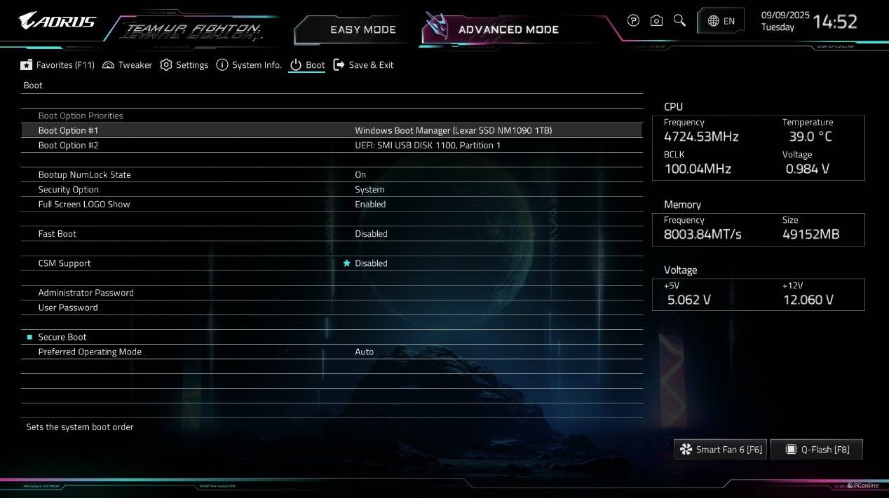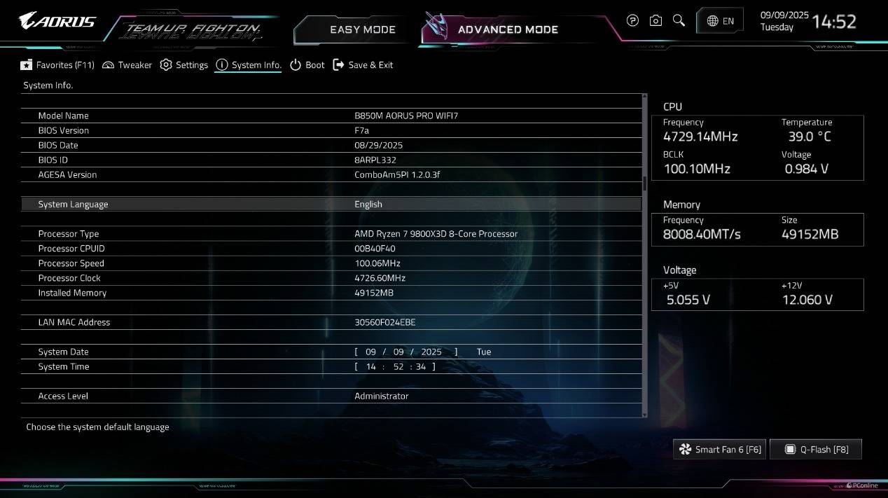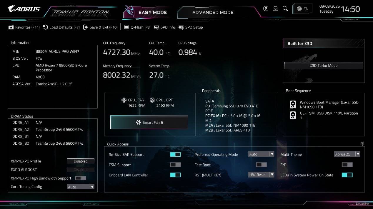 作为主板老牌大厂的出品,技嘉B850M电竞雕主板在BIOS界面的功能设置布局以及信息展示方面也是非常的完善,不论是简易模式界面还是高级模式界面得功能划分都应对了不同类型用户的使用需求以及使用习惯。想要进入高级模式只需要按下F2即可。