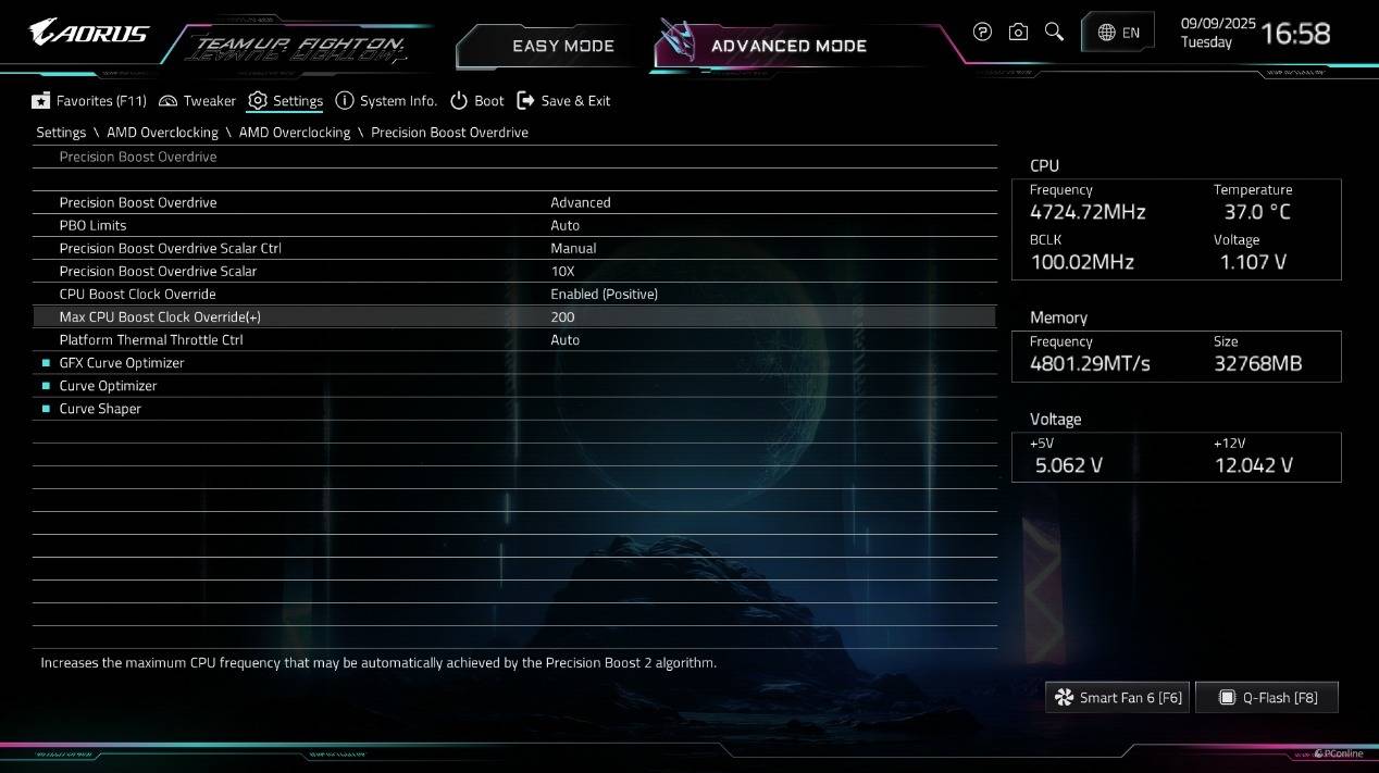 设置页面则包含了一些常用的功能。例如在AMD Overclocking页面能够开启AMD官方的PBO功能。你甚至还可以手动超频,实现更强的性能释放。