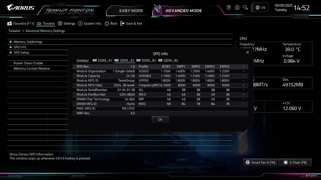 在系统信息页面还能查看到内存的SPD信息,例如我们使用的这款内存包含EXPO-6000以及EXPO-8000两个档位。
