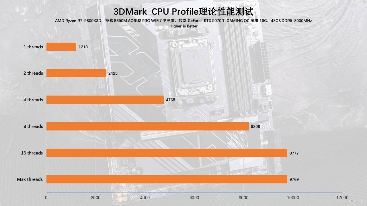 3DMark CPU Profile测试我们也进行了测试,这项测试可以更精准的测试CPU在单核与多核方面的性能表现,实测9800X3D的单线程分数为1218,最大线程分数为9769,表现不错,作为一款专为游戏而生的CPU,这个成绩已经完全能够满足主流用户的需求了。并且有一说一,这个成绩比绝大部分B850主板测出来的都要更高一些。
