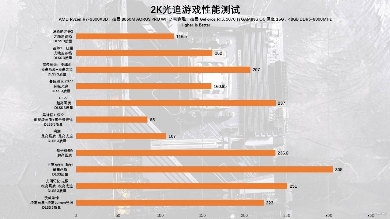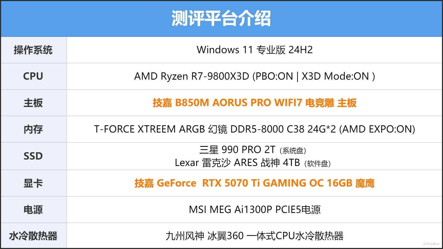 下面是本次测试用到的硬件平台配置。主板毫无疑问是技嘉B850M AORUS PRO WIFI7电竞雕主板,处理器则是目前的游戏神U——AMD 9800X3D,显卡我们用的则是技嘉同款GeForce RTX 5070 Ti GAMING OC 16GB魔鹰。