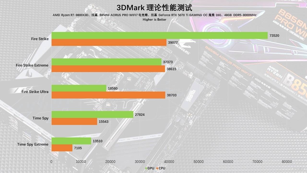 紧接着我们还测试了基本的3DMark理论性能,无论是在DX11的Fire Strike项目,还是DX12的Time Spy项目,成绩均相当优秀,特别是在Fire Strike中,9800X3D的成绩直接逼近4W分大关,技嘉B850M电竞雕主板12+2+2的出色供电配置才让这颗游戏神U有了不错的性能释放空间。