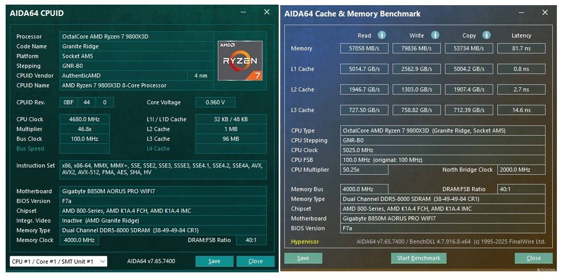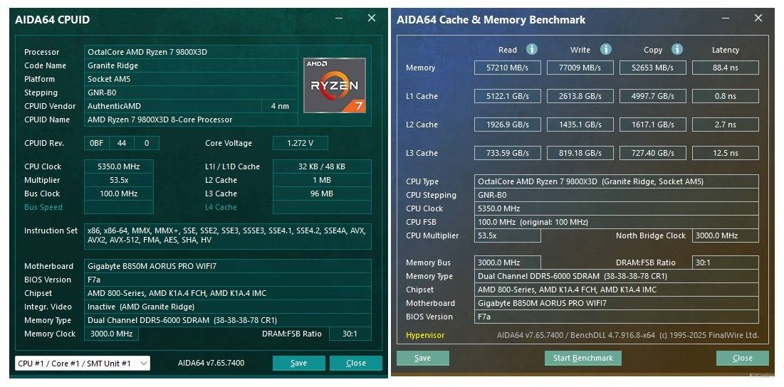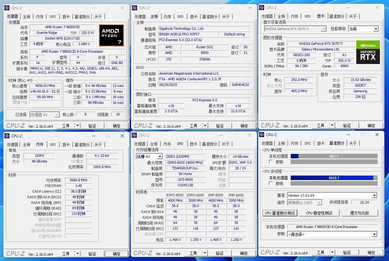 上机后,依照惯例,我们还是先在CPU-Z中看看平台硬件信息,同时也可以对处理器进行一定的性能测试。主板为上面提到的技嘉B850M电竞雕主板,支持PCIe 5.0标准。性能释放方面,实测9800X3D跑出了单核827.1,多核8552.7的成绩。