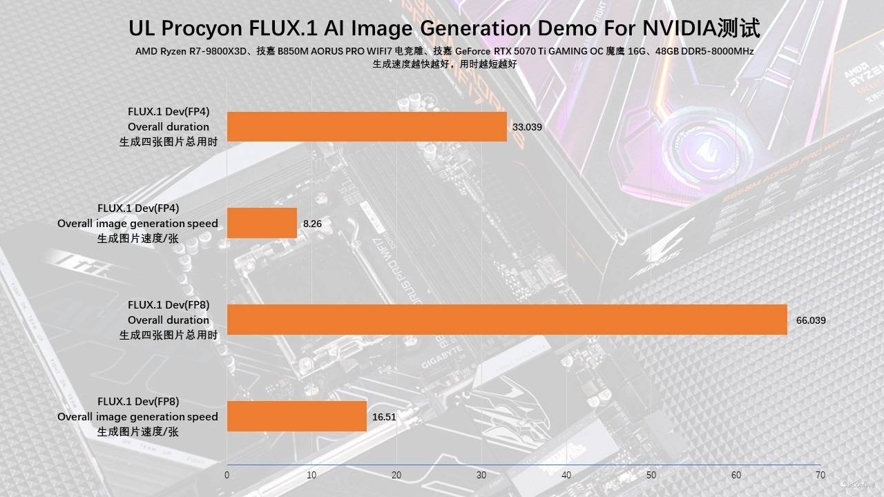 我们再来看看AI方面的表现,我们用UL Procyon测试了这套平台的AI文生图性能,实测在RTX 50系显卡支持FP4精度的黑科技之下,这套平台能够实现8.26 s出一张图的实力。相比仅支持FP8精度的话,效率要足足快了一倍左右。
