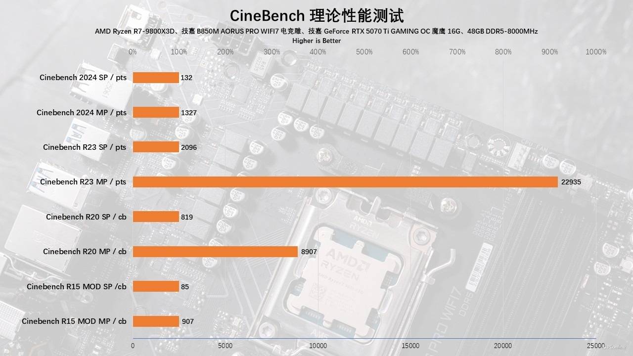 最后是CineBench测试,涵盖从早期的 CineBench R15 到如今更具挑战性的 CineBench 2024 各个版本。9800X3D在技嘉B850M电竞雕主板上的性能释放还是非常激进的,尤其是在R23版本当中,多核性能直接逼近23W分,单核成绩也离2100只有一步之遥。而在压力更大的2024版本中,也完全不输一些X870主板上的表现。