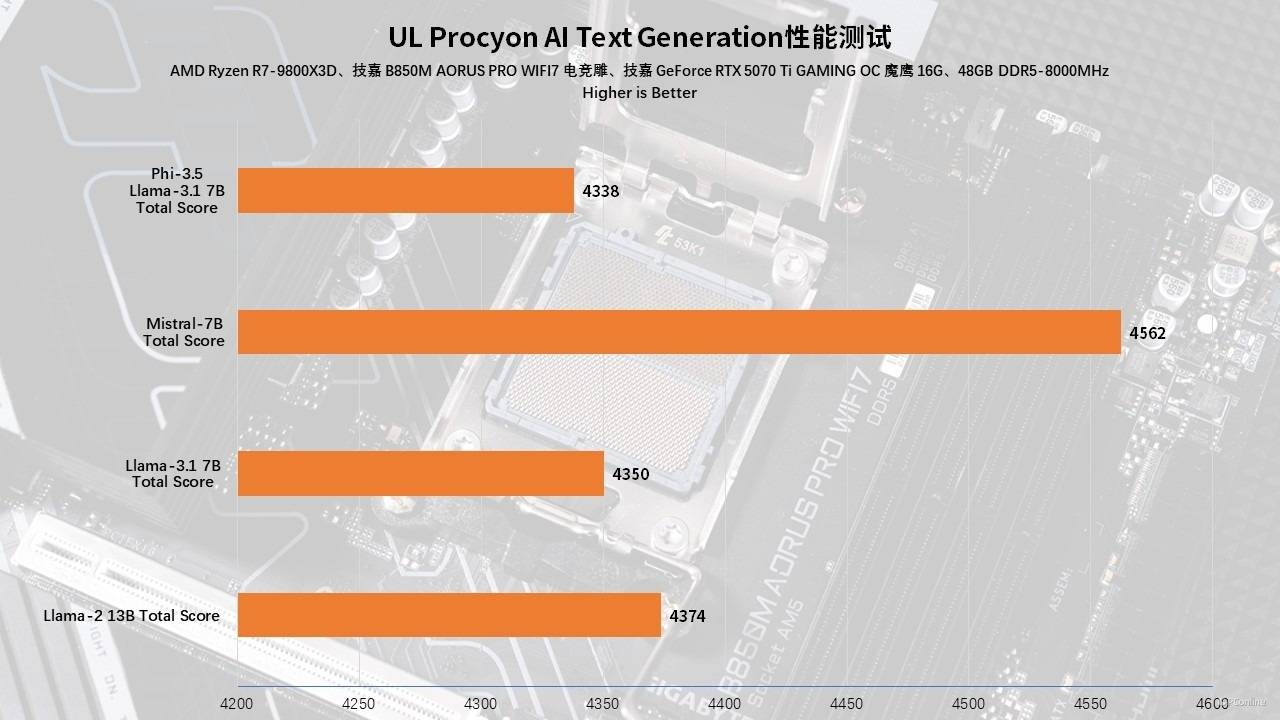 随后,我们利用UL Procyon的AI Text Generation对多个大型语言模型进行了进一步测试。实测技嘉B850M电竞雕搭配9800X3D以及技嘉GeForce RTX 5070 Ti GAMING OC魔鹰,能够从容的应付目前常用的大模型,运行起来可以说是丝滑流程,回答问题时速度也非常快,完全可用。