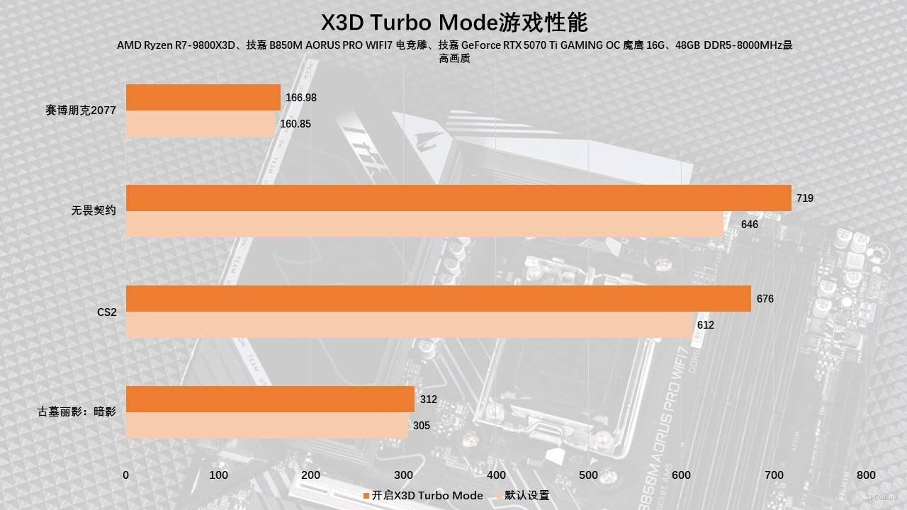 另外,这款主板还支持X3D Turbo Mode功能,它的原理就是在X3D处理器上关闭SMT技术模拟的逻辑核心,并关闭没有配备3D V-Cache缓存的CCD,让游戏都运行在8个真实的物理核心之上,因此让部分游戏获得更佳的表现。实测在开启X3D Turbo Mode之后,AMD 9800X3D确实在不少游戏中都进一步提升了帧率,对于玩家来说,相当于享受到了免费的性能升级。