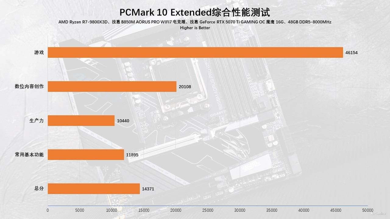 实测这套以技嘉B850M电竞雕主板为核心的平台在性能测试中取得了相当出色的成绩,总分为14371,其中常用基本功能得分为11895,生产力方面为10440,数位内容创作高达20108,而在游戏性能测试中更是达到了46154分。这一优异表现得益于Zen5架构的创新设计以及先进的5nm制程工艺所带来的强大性能提升。与此同时,搭配一块性能强劲的显卡(如技嘉GeForce RTX 5070 Ti GAMING OC魔鹰),也能使整个电脑平台的运行体验更加流畅和出色。