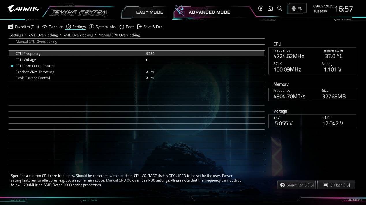 最后我们还进行了手动超频降压,在BIOS内将我们手上的这颗9800X3D的频率调整至5.35GHz,如果你的CPU体质足够好,甚至还能进一步做到5.4GHz,实现更强的性能释放。