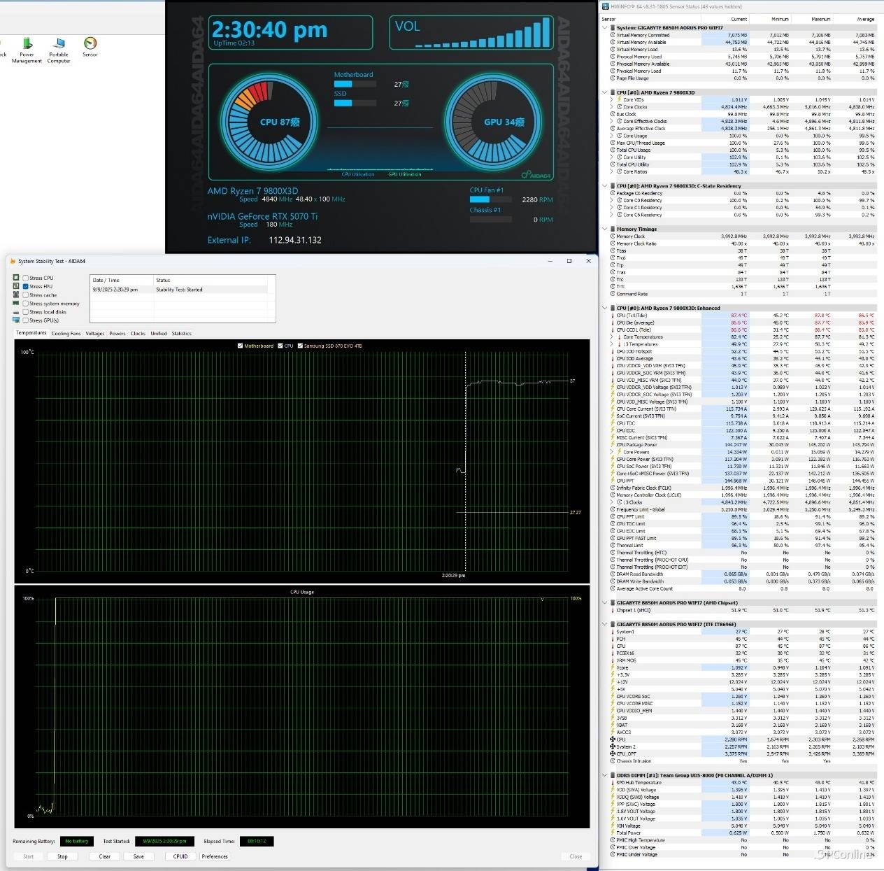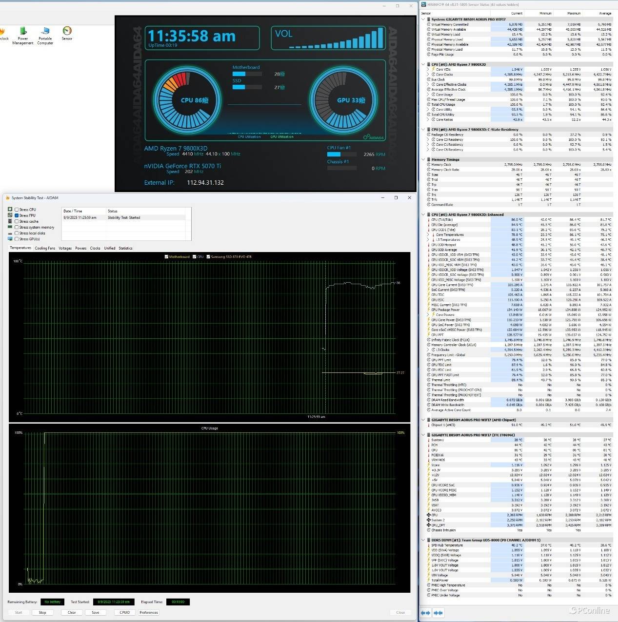 最后的测试自然是AIDA 64 FPU烤机测试,实测在启用AMD官方PBO的情况下,烤机10分钟以后,整机进入稳定状态,处理器温度为86度,处理器功耗达到了134 W,频率则是维持在4.4GHz左右。此时主板VRM MOS上的温度为43度。