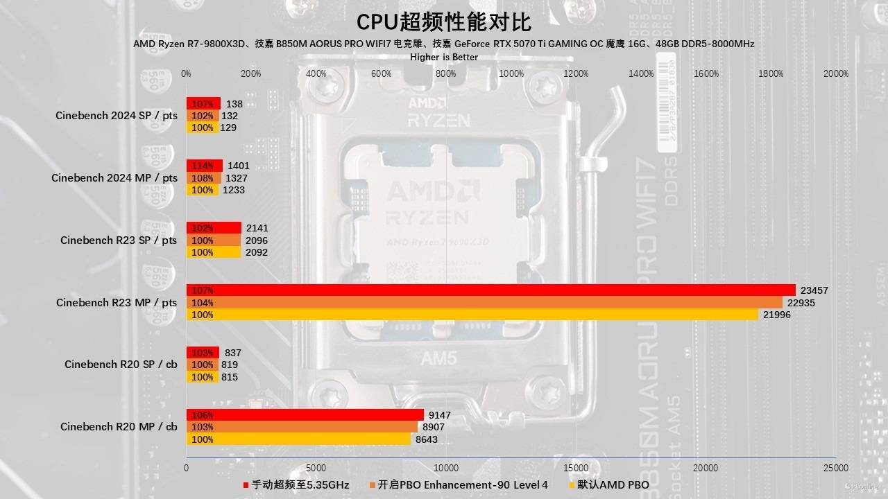 并且我们还在AMD PBO Auto、PBO Enhancement 90度 Level 4以及手动超频5.35GHz的情况下,分别测试了9800X3D的性能释放,实测结果如下:
