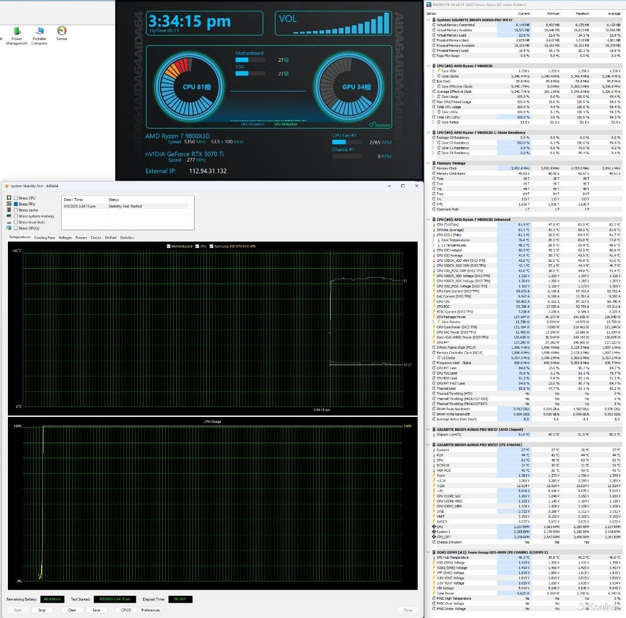 在手动超频以后,我们还是烤机10分钟,不得不说技嘉B850M电竞雕的潜力还是非常大的,此时我们的处理器温度仅有81.5度,功耗则为137 W,频率就更夸张了,全程都能稳定在5.35GHz,主板的VRM MOS温度与之前两次烤机也几乎没有差别,均为43度。