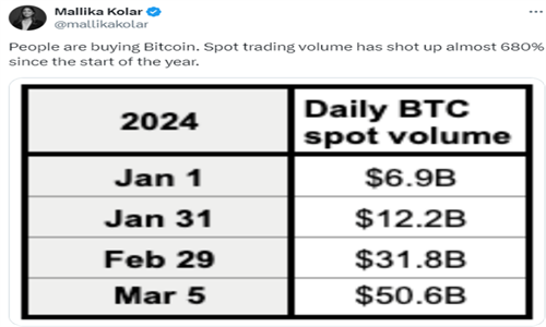 今年以来,比特币现货交易量已经飙升了将近680%!交易所交易基金的流入量也创下了历史新高。彭博社的ETF分析师埃里克·巴尔布纳斯说,3月5号,美国的比特币交易所交易基金的日成交量达到了100亿美元,超过了上周创下的77亿美元的纪录。这就像股市里的明星股,大家都抢着买。