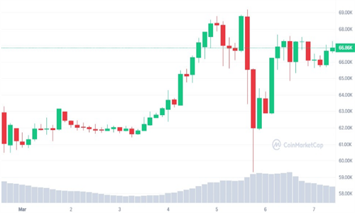 交易所和交易所交易量的飙升,直接推动了比特币价格在3月5号创下历史新高,超过了69200美元。虽然价格有点波动,但比特币的市场地位还是很稳固的。数据显示,在协调世界时下午1:30前的24小时内,比特币价格上涨了1.09%,达到了66878美元。